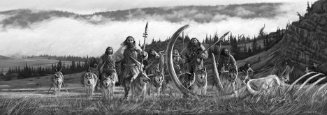 Kolem ohniště sedí skupinka pravěkých mužů a žen. Pouští se do upečeného masa a nedočkavě trhají pečínku na kusy. Pečlivě ji okusují a ohlodané kosti odhodí za záda. Ve stínu stromů se objevují psi. Pomalu se přibližují k ohništi. Jsou obezřetní. Když ale vidí, že je lidé nechávají na pokoji, pustí se do hostiny.
