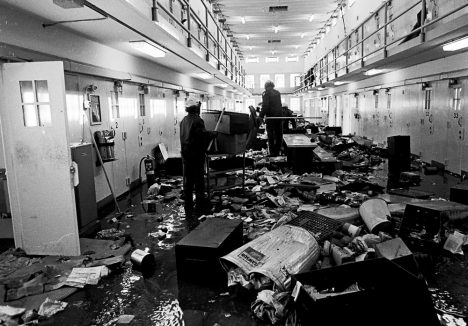 Vzpoura se uskuteční ve dvou blocích věznice. Vězni také založí požár ve skladu jídla. Ten se rozšíří do obytných částí věznice s trestanci zamčenými v jejich celách.
