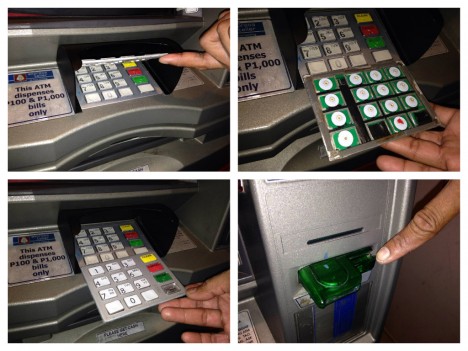 Používají falešné čtečky karet, které vmontují do bankomatu tak, aby byly co nejméně nápadné. Pak buď přidají miniaturní kameru sledující zadávání PINu, nebo přímo pod klávesnici bankomatu vmontují zařízení, které zadané číslo zaznamená. Informace si pak zloději z bankomatu stáhnou.,