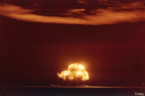 16. července 1945 v poušti White Sands na cvičné střelnici vojenské základny Alamogordo expoloduje zařízení se silou 20 kilotun TNT. Exploze zanechává 330 metrů široký kráter a tlaková vlna je cítit 160 kilometrů daleko.
