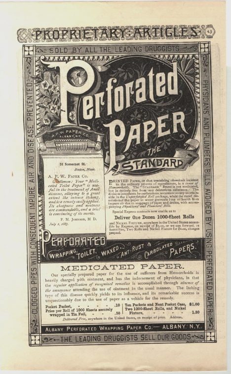 S rolemi toaletního papíru se jako první vytasí anglická firma British Perforated Paper Company v roce 1880. „Počítáme s ním hlavně pro holiče, aby si měli kde otírat použité břitvy,“ zamýšlí vedení firmy.