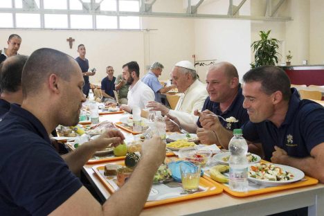 Pak jde do kavárny v suterénu Domu svaté Marty na croissant. Papež snídá kolem osmé. Tady si sedne k obvyklému stolku s několika hosty. Nikdy nejí sám, nemá to rád. Podává se tu jídlo jako v typických italských restauracích.
