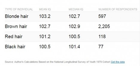 Blondýny se oproti ostatním lišili v průměru jen zhruba o tři body, což není moc, nicméně to s určitostí dokazuje, že nejsou hloupější než brunety či zrzky.