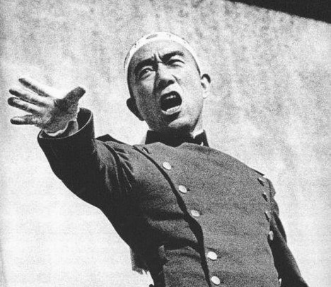 K odmítnutí nové slabošské ústavy a k svržení císaře Hirohita (1901-1989), který zradil japonský lid, jeho historii i kulturní dědictví. Mává rukama, tváře mu planou.