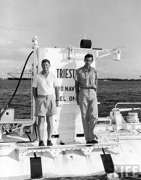 Krátce po deváté hodině ráno za sebou on a Piccard zavírají poklop. Krátce poté energický námořník americké armády a málomluvný švýcarský inženýr zahájí sestup.