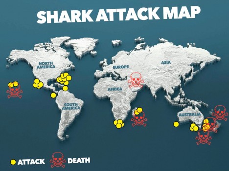 K nejvíce útokům došlo ve Spojených státech, bylo jich celkem 59, z toho 30 na Floridě. Austrálie zaznamenala 18 napadení žralokem, Jižní Afrika 8 útoků.