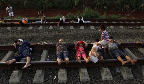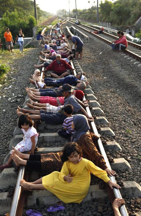 Dav lidí se vrhá na koleje. Ještě vibrují, jak se po nich právě prohnal vlak do Jakarty. Uléhají jeden vedle druhého. Stará žena otevírá slunečník, aby jí slunce nesvítilo do očí. Zamračený železničář se je marně snaží vyhnat.