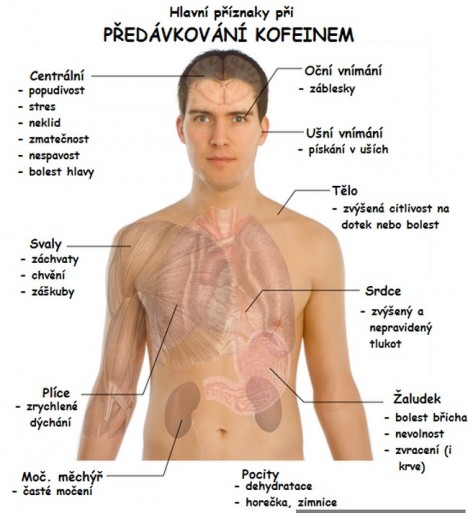 Zablokuje ty, které jsou odpovědné za signály o únavě, a aktivuje jiné. Smrtelná dávka čistého kofeinu je 150 mg/kg váhy. Takže 80kilového člověka by zabilo 12 gramů! Ale tohle množství by v čaji, kávě nebo limonádách představovalo desítky litrů… Konkrétně: