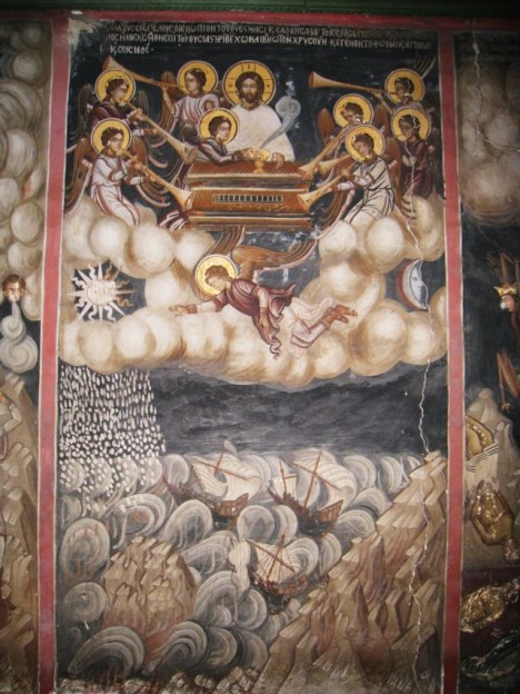 Katastrofy popsané v Apokalypse svatého Jana jsou spojeny s rozlomením sedmi pečetí, které doprovází objevení se čtyř příšerných jezdců Apokalypsy: Moru, Války, Hladu a Smrti. Následuje troubení na sedm polnic.