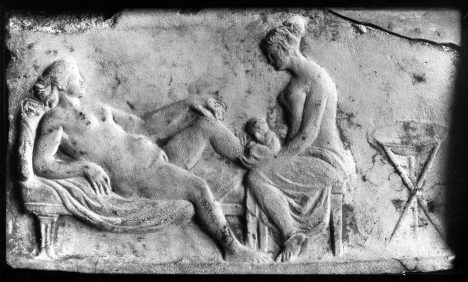 Porodník poděkuje Lukrécii za pomoc. Většina lékařů ale do té doby porodní báby podceňuje. Třeba řecký filosof Aristoteles (384 – 322 př. n. l.) o nich pohrdlivě říká: