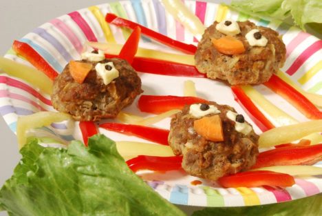 Nakrájejte nadrobno cibulku, prolisujte česnek a společně s kořením, kečupem a solí předejte dětem, ať vše promíchají s mletým masem. Směs poté rozdělte na osm dílů, ze kterých s dětmi uhnětete placatá těla pavoučků.