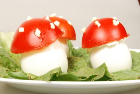 Vy zatím můžete rozpůlit rajčata a vydlabat jejich vnitřky. Malí šéfkuchaři je naplní směsí lučiny a smetany. Část lučiny si ale nechte stranou – patří na klobouk muchomůrky jako nepostradatelné tečky. Nezapomeňte ale dětem vysvětlit, že opravdovou muchomůrku by jíst neměly.