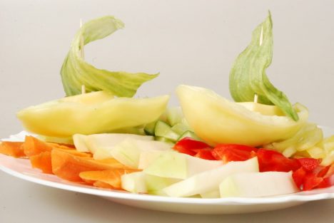 Omytou zeleninu nakrájejte na podlouhlé hranolky, jednu či více paprik pouze rozkrojte napůl a očistěte od semínek. Děti nechte poskládat z hranolků zeleniny rozbouřený oceán. Na něj pak umístíme lodičky.
