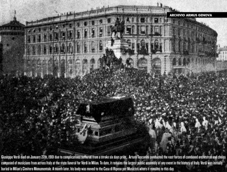 Italský dirigent Arturo Toscanini (1867–1957) během posledního rozloučení se skladatelem řídí pěvecký sbor o 900 členech, který provede slavný sbor Židů z opery Nabucco „Va, pensiero, sull´ali dorate (v překladu Leť, myšlenko na zlatých křídlech).