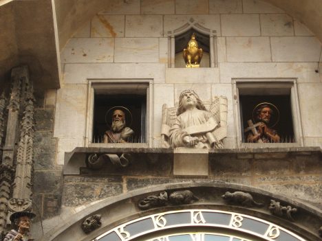 Dvanáct apoštolů postupně vyhlédne ze dvou oken. Lakomec třese svým naditým měšcem a marnivec se zálibně prohlíží v zrcadle. Astronom pozorně sleduje oblohu, filozof důkladně zkoumá svět a vše zapisuje do svých letopisů kronikář.