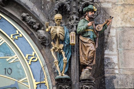 Kostlivec na znamení pomíjivosti lidského života otáčí přesýpacími hodinami a nakonec zatahá za umíráček…