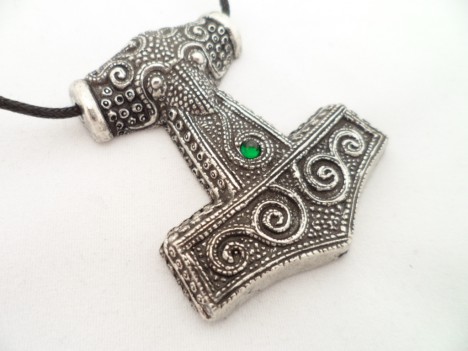 Thórovo kladivo. Bohatě zdobený amulet byl objeven ve švédské provincii Skåne. Znázorňuje zbraň, kterou vládne bůh hromu Thór. Ta měla chránit před zlými démony. Amulet zřejmě plnil podobnou funkci pro svého majitele.