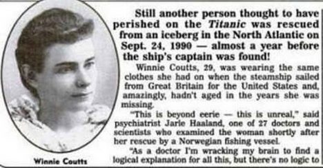 Neznámá zachází do takových podrobností, jako kdyby se skutečně plavila na Titaniku. Navíc se prý i podobá skutečná Winnie Coutts, jejíž fotografie se zachovala. Jde o důkaz cestování v čase, jak si myslí někteří záhadologové?