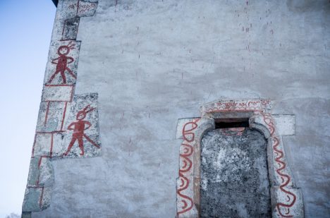 Mnozí lidé o tom ale pochybují a věří, že jde prostě jen o chybu. Jenže záhady tím nekončí. Na jedné vnější zdi lze nalézt namalovanou dvojici červených postav s podivnými čelenkami na hlavách, od kterých vedou pera či blesky. Jde o nezvyklé vyobrazení čertů? Nebo jsou to mimozemšťané, jak tvrdí někteří záhadologové?
