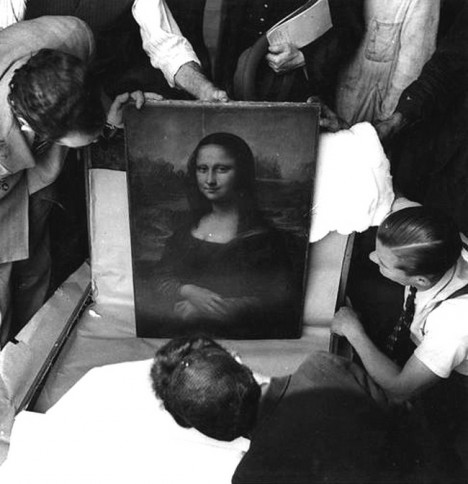 Bílá bedýnka s Monou Lisou od Leonarda da Vinciho (1452 – 1519) je označeno třemi červenými kolečky!
