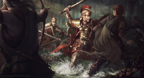 Hustě padající déšť tvoří mohutnou clonu. Je vidět sotva na pár kroků. Lesní terén se už dávno změnil v bahnitou břečku. Římané se nejsou schopni orientovat a germánská kopí je kosí po tisících. „Tohle je ostuda,“ šeptá si Varus. Sahá po meči, aby skoncoval se svým životem.