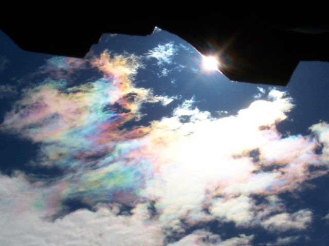 Intenzivní irizací podléhá i vzácný druh tenkých oblaků vyskytujících se ve velkých výškách kolem 20–30 km, tedy ve stratosféře. Jejich perleťový jas se projevuje nejvýrazněji, jsou-li na soumračné obloze ještě osvětlovány paprsky z již zapadlého Slunce.