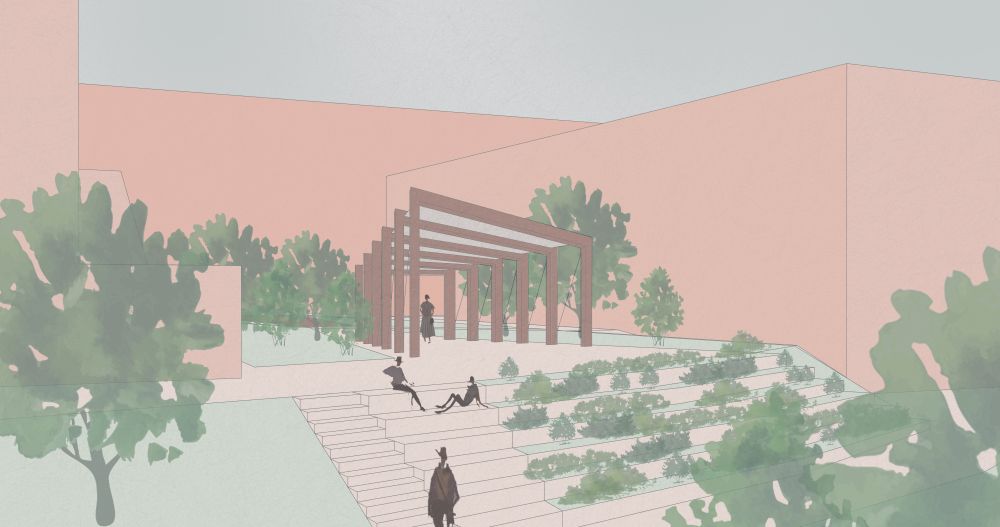 Návrh prostoru atria se tak snaží vytvořit malou zahrádku, jež by mohla být osázená ovocnými stromy, keři, bylinami, kde by se jeho návštěvníci mohli cítit alespoň trochu jako doma na zahradě,“ vysvětlila svou filozofii Blechová.