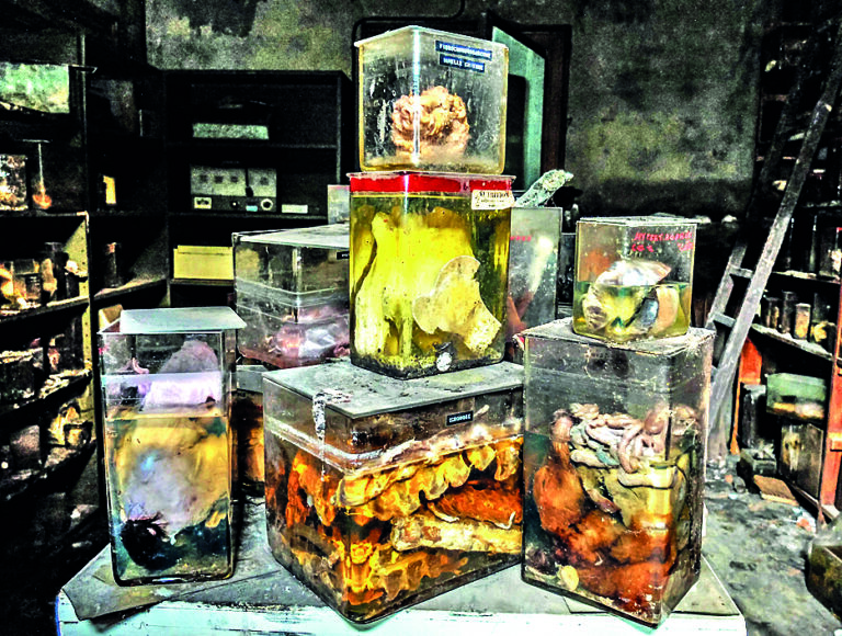 Některé místnosti jsou stále plné anatomických modelů, preparačních stolů a dalších předmětů, které evokují obrazy z doby, kdy zde probíhala výuka a výzkum. Prach a pavučiny se usadily na každém povrchu, a vytvářejí tak vrstvu zapomnění.