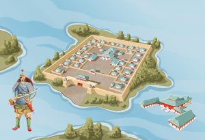 Hlavní komplex ve vnitřním nádvoří měl už v té době střechu pokrytou pálenými taškami a podepíralo ji 36 dřevěných sloupů, postavených na kamenných základech, které byly nejspíše barevně lakovány.