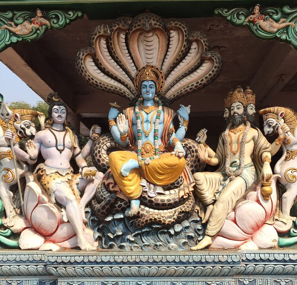 Dokonce, když je nejhůř, bere na sebe fyzickou existenci a vyráží světu na pomoc. Těchto vtělení, tzv. avatárů, je známo celkem 10. Přichází jako ryba, želva, kanec, napůl člověk a napůl lev, trpaslík a obr, lučištník, Ráma, Kršna a Budha. A pořádně si mákne.