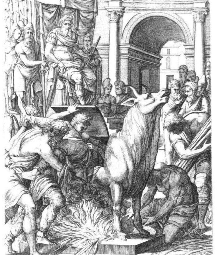 Z útrob bronzového zvířete se ozývá nelidské kvílení. Usvědčený vrah se škvaří zaživa. Diváci si s vyděšenou grimasou zacpávají uši, ale není jim to nic platné. Ozvěna příšerného zvuku je bude pronásledovat ještě dlouho. Jediný, kdo se tváří spokojeně, je sicilský krutovládce Falaris. Posílá na smrt nejenom usvědčené zločince, ale rázně se vypořádá i se svými odpůrci. […]