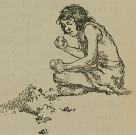 Spokojeně si sedne na svoji „židli.“ Je to sice jenom plochý kámen, ale unavenému lovci bohatě stačí. Konečně má chvíli klidu, ale pronásleduje ho hlad. Hlasitě mu kručí v břiše.