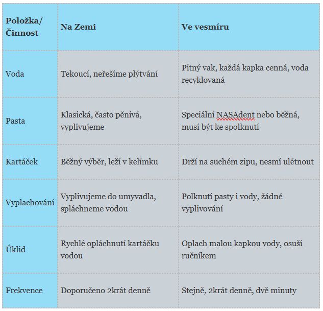 Tabulka: Jaké jsou hlavní rozdíly mezi čištěním zubů na Zemi a ve vesmíru?