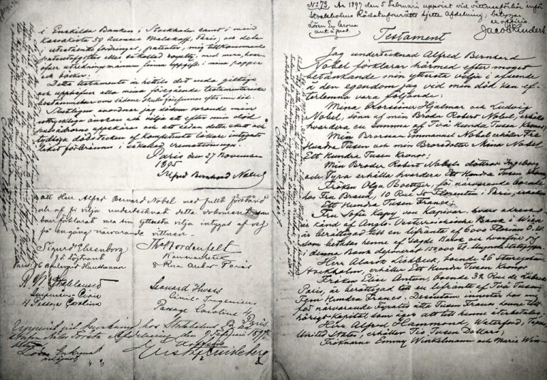 Podle závěti měl být majetek po jeho smrti svěřen… Co bychom však jenom opisovali?! Dejme slovo samotnému panu Nobelovi, který v Paříži roku 1895 právě diktuje svůj testament…