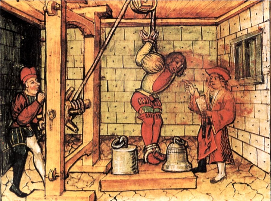 Ruce táhnou vzhůru, zatímco tělo letí dolů k zemi. Náhle dojde k prudkému trhnutí. Oběť nešťastně zavyje bolestí. Ramena trpí, trhají se šlachy. Dav dychtivě zírá na trpícího, který visí nad zemí. Takovou podívanou si přece nemohou nechat ujít..