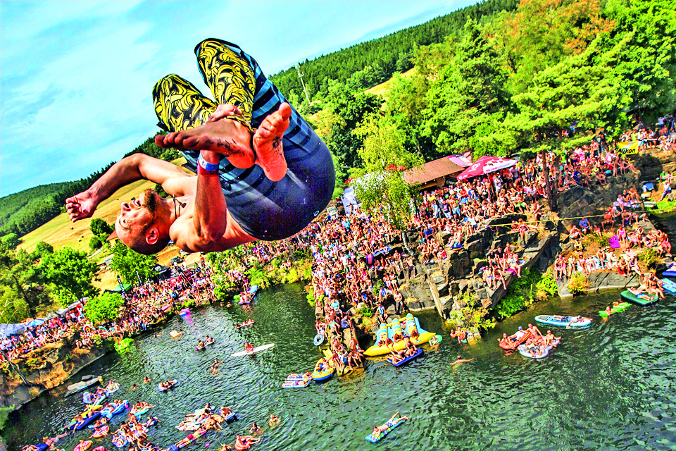Představte si, že stojíte na provizorním skokanském můstku, který tvoří lešení vysoko nad hladinou vody. Díváte se dolů, do černé vody zatopeného lomu. Na jeho dno nevidíte. Všude kolem jsou skály. A tisíce lidí, kteří na vás upírají pohled.