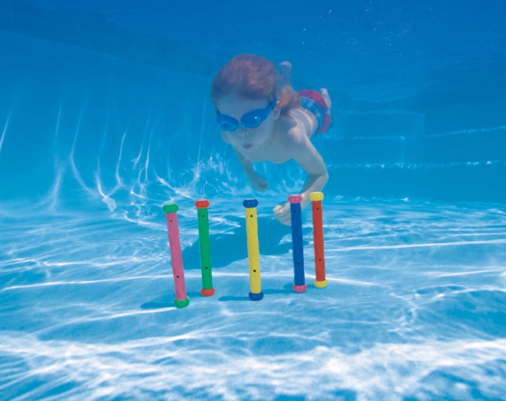 Bojí se vaše dítě v bazénu potápět a rádi byste ho to naučili? Není nic jednoduššího – kupte barevné potápěcí tyčky, které hodíte do vody a ony zůstanou stát u dna. Úkolem je sebrat jich co nejvíce.