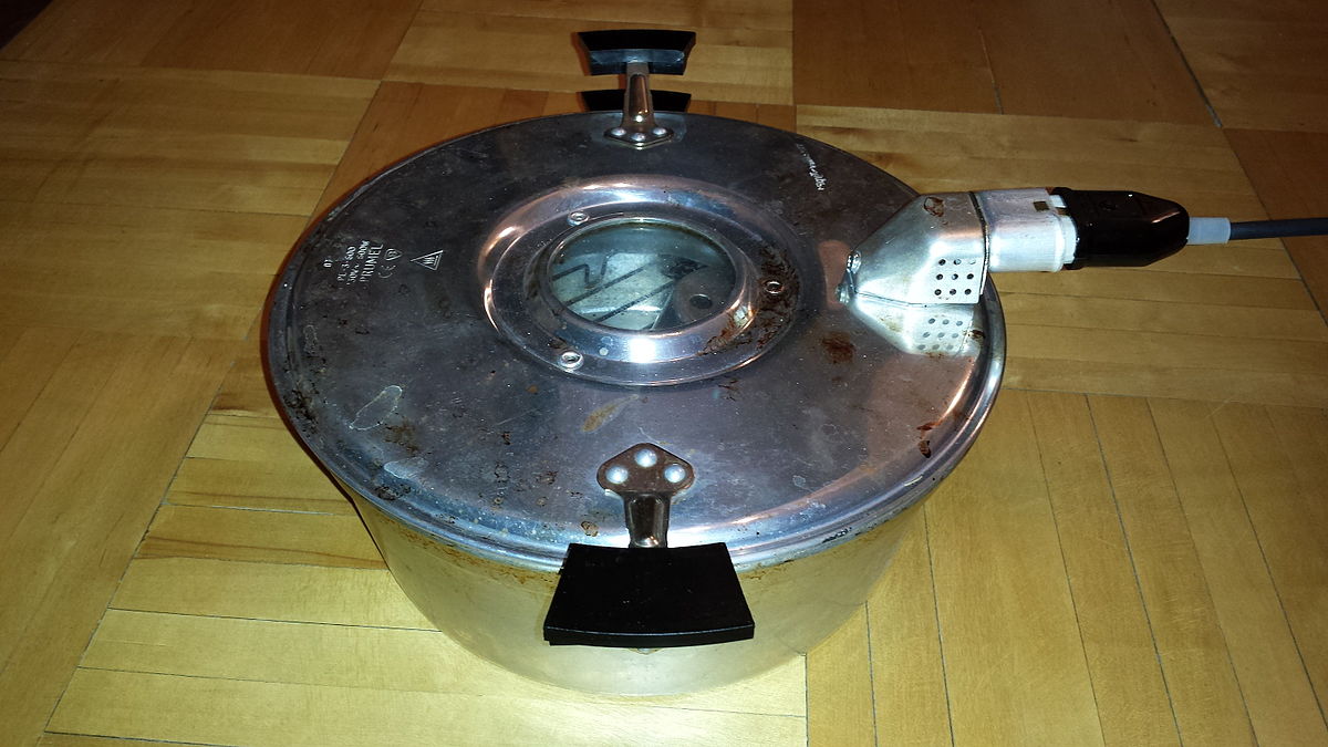 Hlubokou hliníkovou pánev přiklápí víko se zabudovanou topnou spirálou, zaskleným okénkem a otvory na odvod páry. Zatím chybí regulace ohřevu a vnější izolace, ale to se napraví.