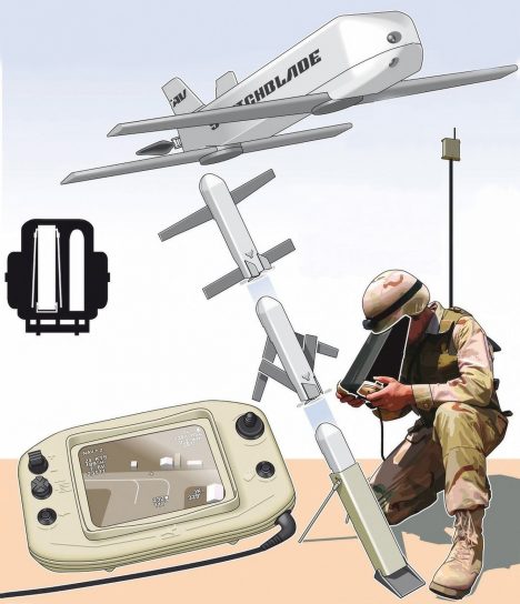 Dron Switchblade vyrábí společnost AeroVironment. Jde o ruční řízenou střelu s křídly o rozpětí 60 cm a s celkovou hmotností 2,5 kg. Elektromotor dokáže Switchblade udělit rychlost až 150 km/h. Maximální dolet je 10 km, výdrž ve vzduchu 10 minut.