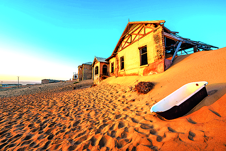 Uprostřed rozpálené Namibské pouště leží Kolmanskop, kdysi vzkvétající diamantové město, které po nálezu diamantů v roce 1908 rychle vyrostlo z písečných dun.