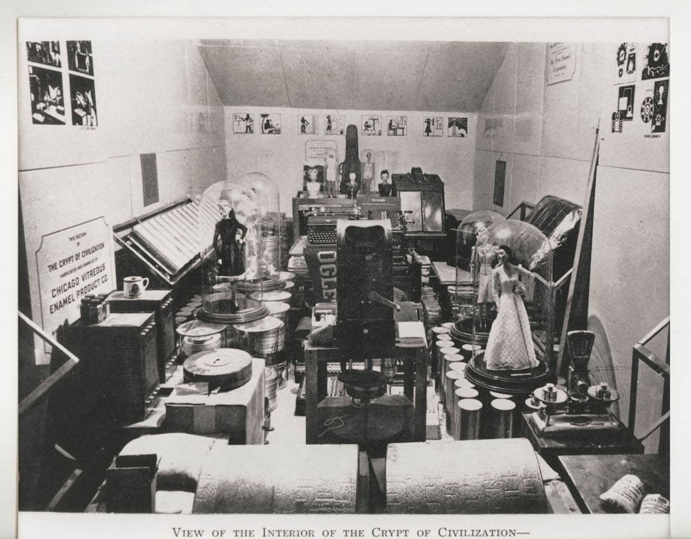 „V nádobách z nerezavějící oceli, v nichž byl vzduch nahrazen inertními plyny, jsou encyklopedie, vědecké práce, speciální vydání novin, cestopisy, filmové kotouče, fonografické záznamy a podobné materiály, z kterých lze zjistit stav a povahu civilizace, která existovala v první polovině 20. století,“ píše se mimo jiné na ocelové desce nad vstupem.