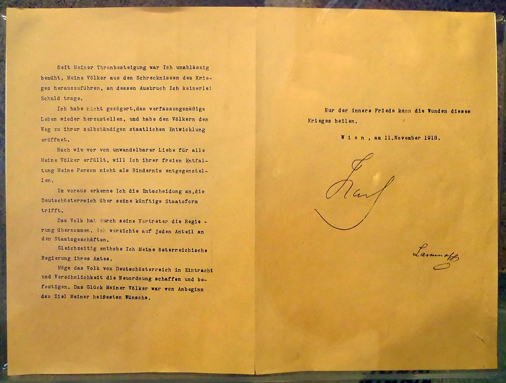 „Monarchie přestala již existovat, takže manifest není aktem abdikace,“ radí dotyčný. V poledne se Karel I. chápe pera a podepisuje.
