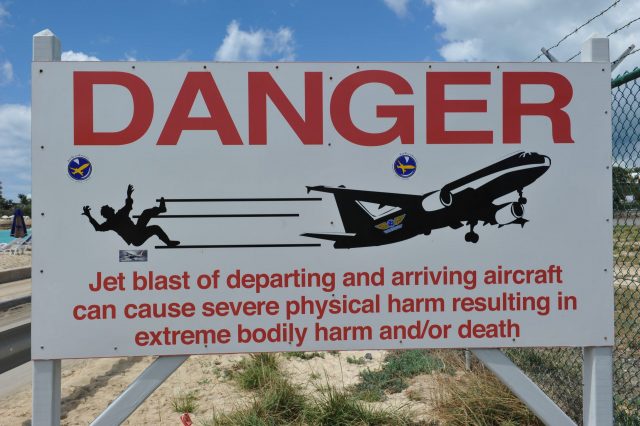 Tento zážitek může být velmi nebezpečný. Při startu se často stává, že přihlížející turisty horké výfukové plyny odmrští do písku, ale i na beton. Navíc se poměrně blízko opačného konce ranveje tyčí vysoké hory.