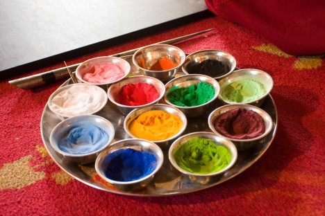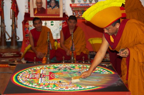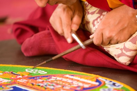 Pomocí trychtýřovitých nástrojů zvaných čhagpur, jistou rukou a bez jediného zaváhání vysypávají mniši na desku uprostřed nádvoří obarvený písek. Vytvářejí dokonale symetrický obrazec, který je symbolickým zobrazením buddhistické představy vesmíru.