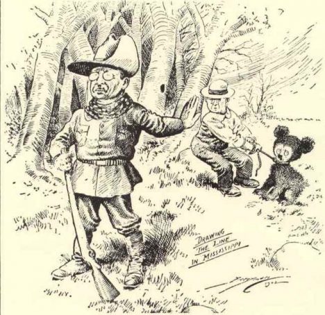 Když mu nakonec přitáhli medvídě, aby si konečně mohl vystřelit, odmítl to jako nesportovní se slovy: „Cožpak bych se pak mohl podívat do očí svým klukům?“ Historku provází karikatura Clifforda Berrymana a Morris dostává nápad.