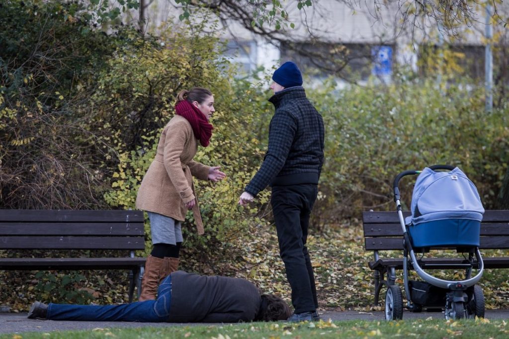 Zřejmě si nevšimnou zbraně, která je od samého začátku odjištěná a nabitá. Muž s kočárkem vyrazí k lavičce. „Slečno, potřebujete pomoc?” ptá se a odpověď na jeho otázku bude natolik brutální, že nikdo z přihlížejících nedokáže zareagovat.