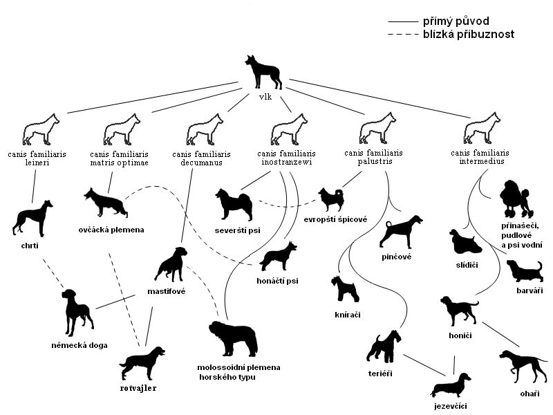 Canis familiaris decumanus, předchůdce dog, byl robustní. Některá jeho plemena se od antických dob téměř nezměnila. V mladší době kamenné se vyskytoval i Canis familiaris leineri, pravděpodobně předek chrtů.