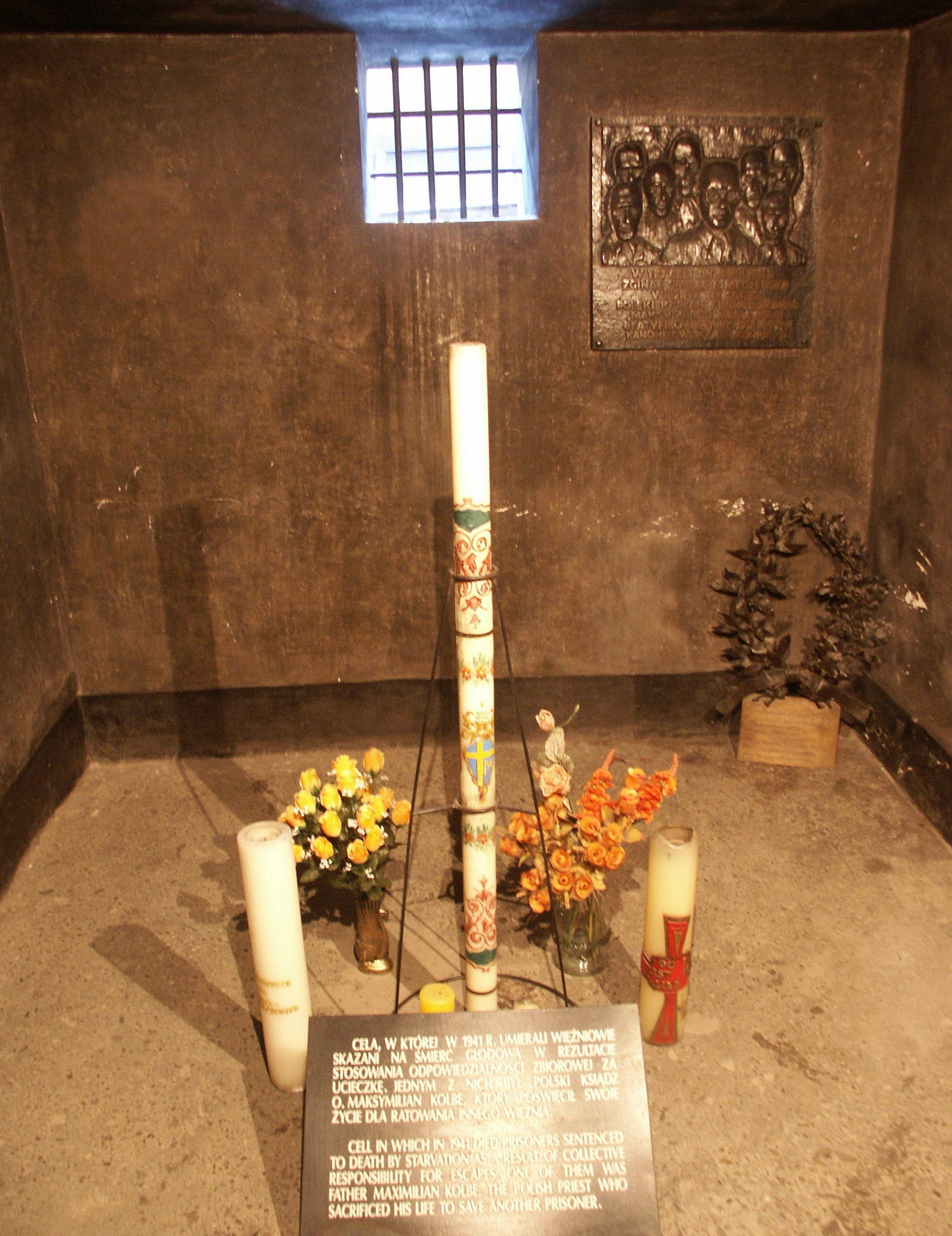 Uvězněný kněz zde na podlaze pouze s blaženým výrazem mlčky sedí. Esesáci by ale rádi do kobky hodili další nebožáky a tak vězně po dvou týdnech bez jídla a vody usmrtí injekcí.
