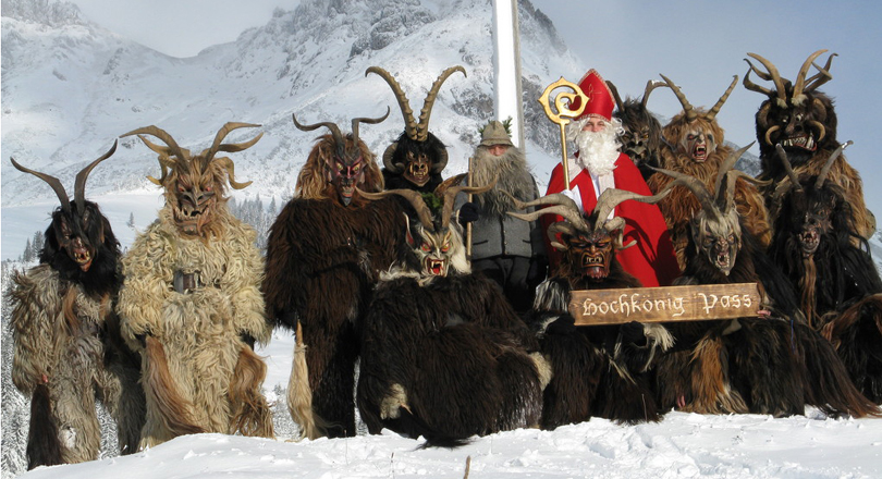 V alpských oblastech existuje už od pohanských dob tradice, kdy se lidé maskují za strašidelné postavy, navlečené do zvířecích kožešin.