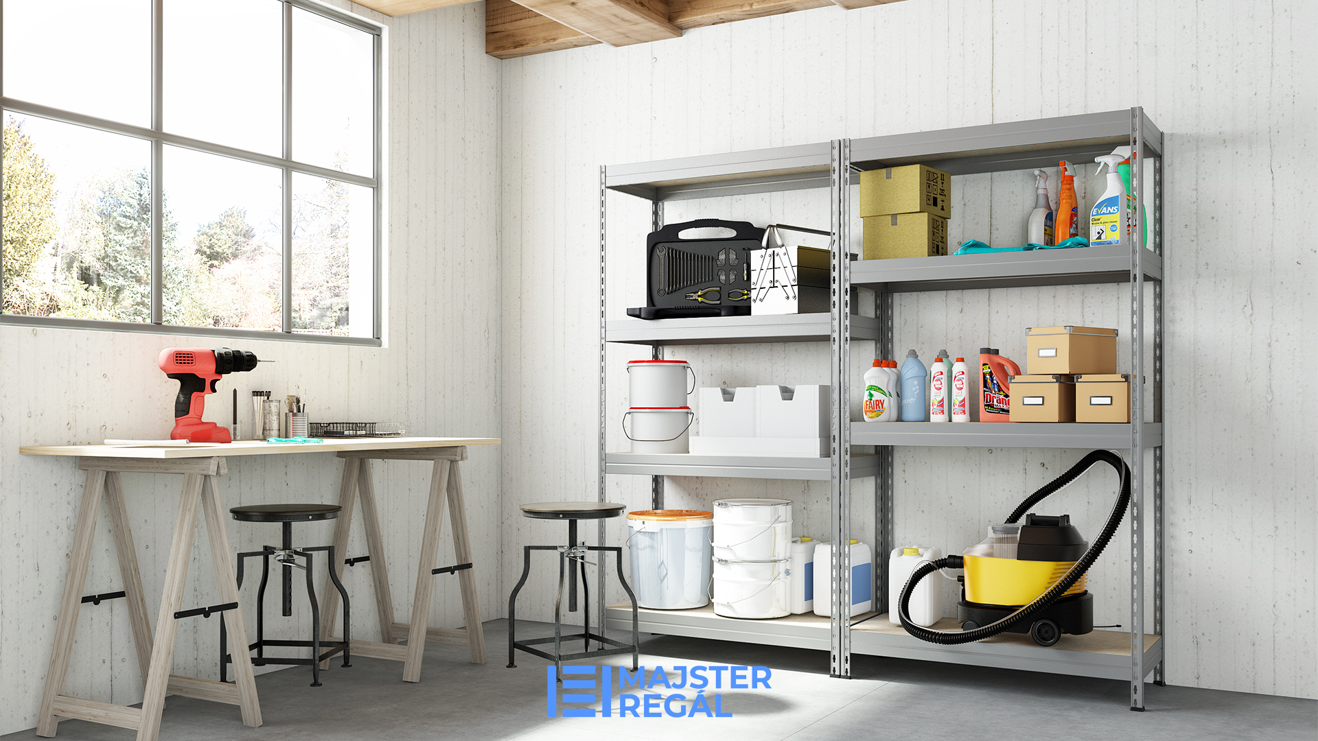 Kovové regály Majster Regal jsou vhodné jak do sklepa, tak do dílny, spíže nebo do garáže. Jsou jednoduché pro použití, díky jednoduché a rychlé montáži. Nepoužívají se zde šrouby, ani nepotřebujete vetší sílu na jejich sestavení.